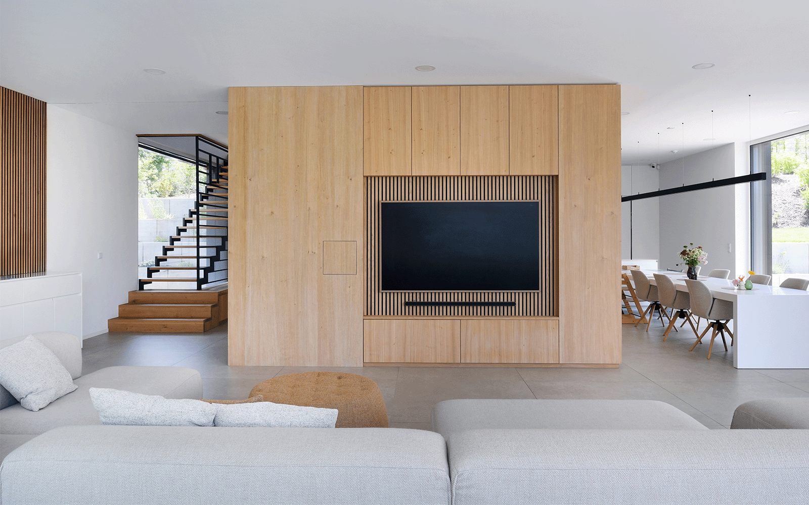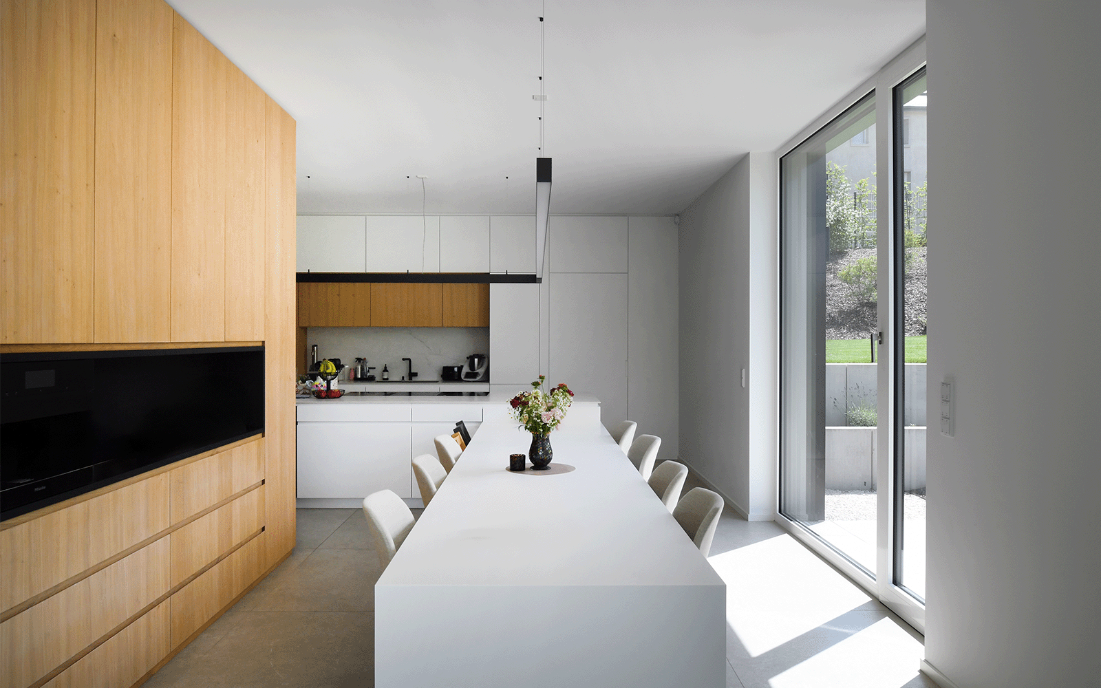 À l’intérieur, matériaux élégants, lumière naturelle et lien fort avec l’extérieur définissent l’ambiance du lieu. Le projet mise sur une excellente inertie thermique et un aménagement paysager en gradins pour un cadre de vie harmonieux et durable.