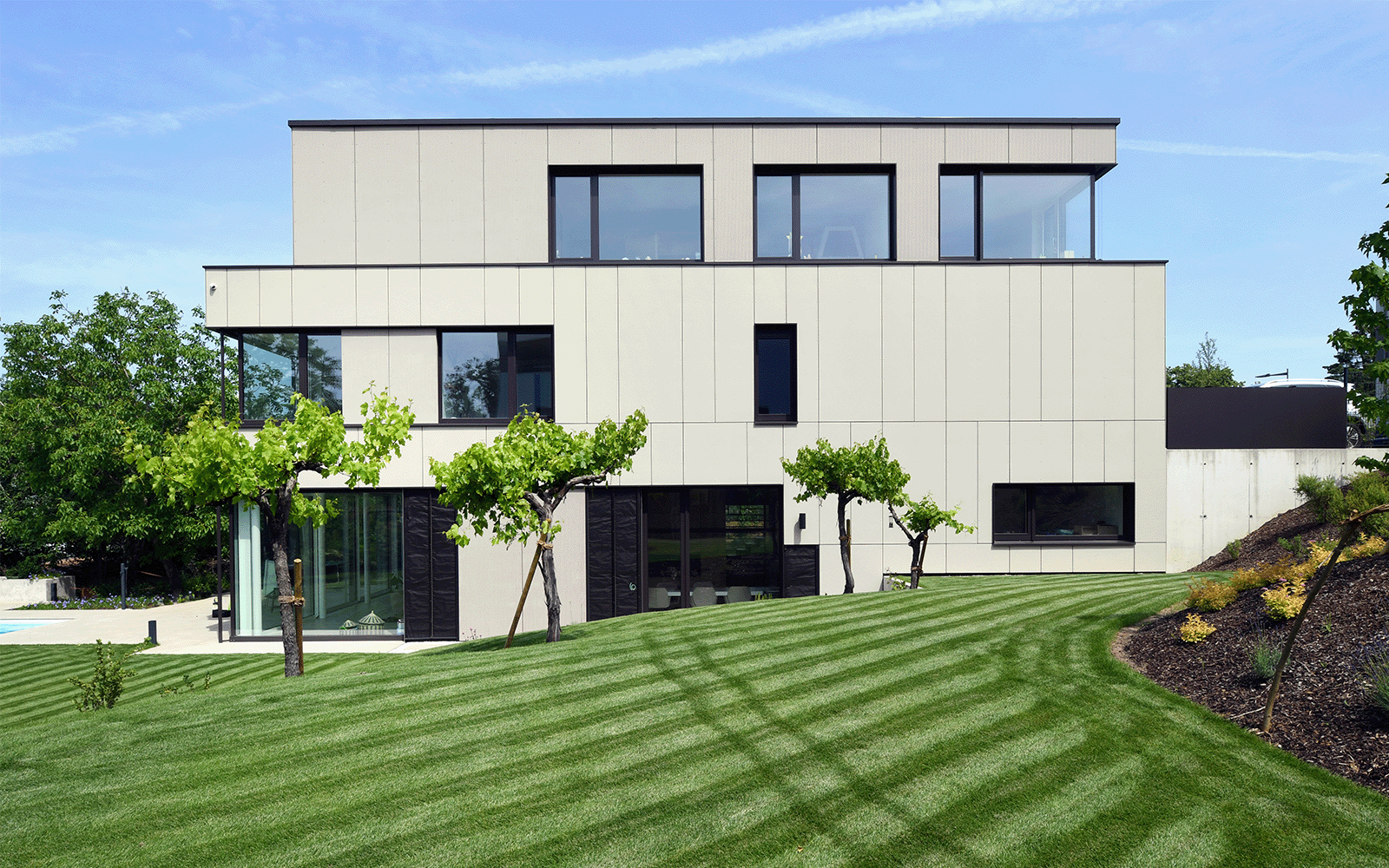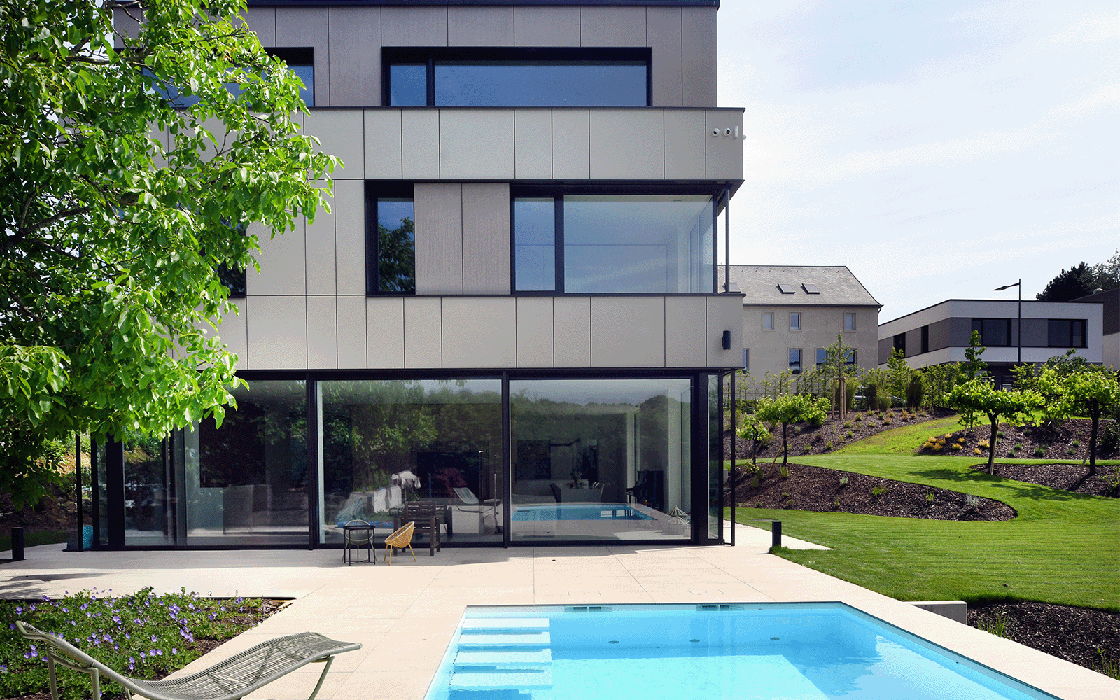Implantée sur un terrain fortement incliné, cette maison unifamiliale s’intègre à la topographie en jouant avec les niveaux.