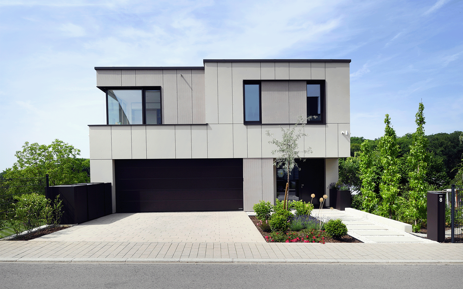 La structure en béton et maçonnerie est habillée d’un bardage ventilé en fibrociment aux teintes sobres, pour une esthétique contemporaine et durable.